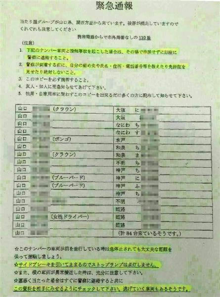 という返答が。詳しく聞くと、20~30年前にも山口ナンバー数十台の「当たり屋情報」が、ファクスなどで出回ったことがあるという。