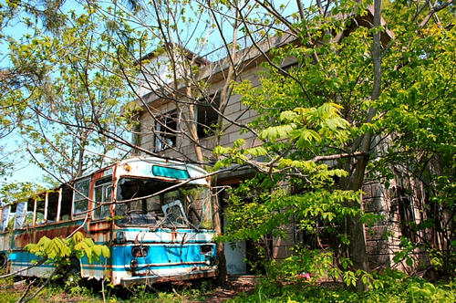 施設にはエテルナ教会という教会や、送迎用と思われる廃バスなどが見られる。