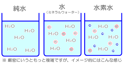 ミネラルウォーターにはマグネシウムやカルシウム、カリウムなどのミネラルが含まれています。水素水はそれに加え、水という形になっている以外の水素が人為的に入れられているというわけです。