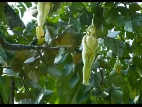 裸のアジア系の女性を思い起こさせる形の実が木の枝からぶら下がっている様子は、インターネットに登校された動画で見ることができる。
