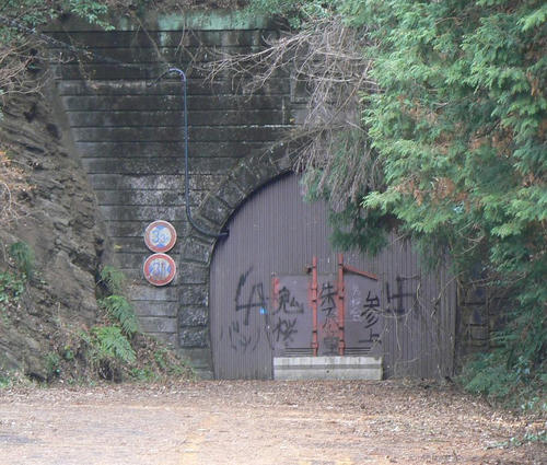 トンネルの入り口は鉄の扉で堅く閉ざされており、反対側の扉も壊れて通り抜けができなくなっている。