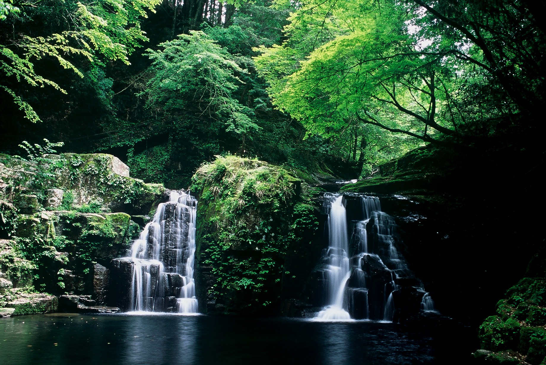 ほとんど垂直の断崖に沿って落下し、落ち口の幅13m、滝壺までの落差は133m。一段の滝としては日本一を誇る。