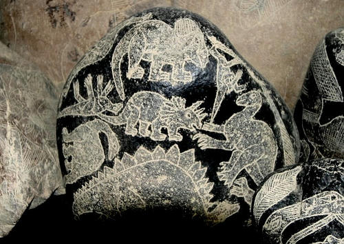 この石には驚くべきことに約6500万年前に絶滅したはずの恐竜たちの絵が描かれているという。