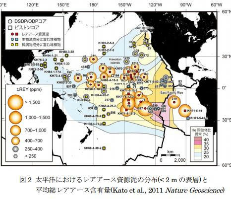 レアアースを含んだ泥は中央太平洋の約880万km2および南東太平洋の約240万km2に分布しているとみられ、水深約3,500~6,000mの地域とのこと。約2km四方で日本が消費するレアアースの1~2年分程が採取でき、海底泥全体には陸上に埋蔵されているといわれている量(約1億1千万トン)のおよそ800倍の量が埋蔵されていると推測されるそうだ。