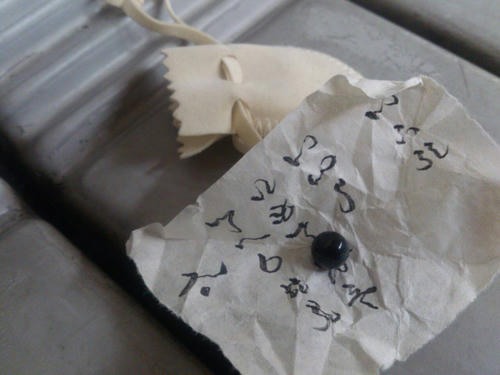 どこにでもある指輪袋みたいなんに、紙でくしゃくしゃっと珠包んであったから店売りのお守りとは思いませんでした。