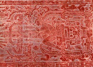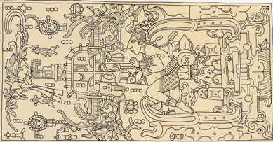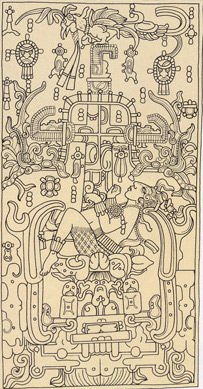 これは生命樹の下に寝そべる王を表現したものであり、ロケットのように見える部分はトウモロコシであるという見解が現在は主流。