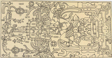 1952年メキシコの考古学者ルイリエールによって、パレンケ神殿の地下から発見された、パカル王の石棺の蓋に描かれたレリーフは、当時の人間が乗り物らしきものに乗り、手には操縦捍を握り、足はペダルのようなものに乗せているように見える。