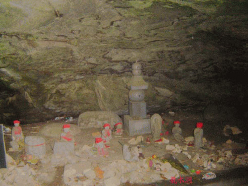 洞窟の横には「餓鬼堂」と掘られた石碑が建てられており、洞窟内には何十体もの水子地蔵群が奉られている。