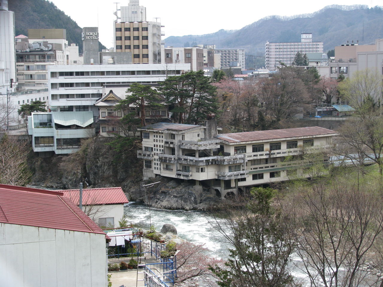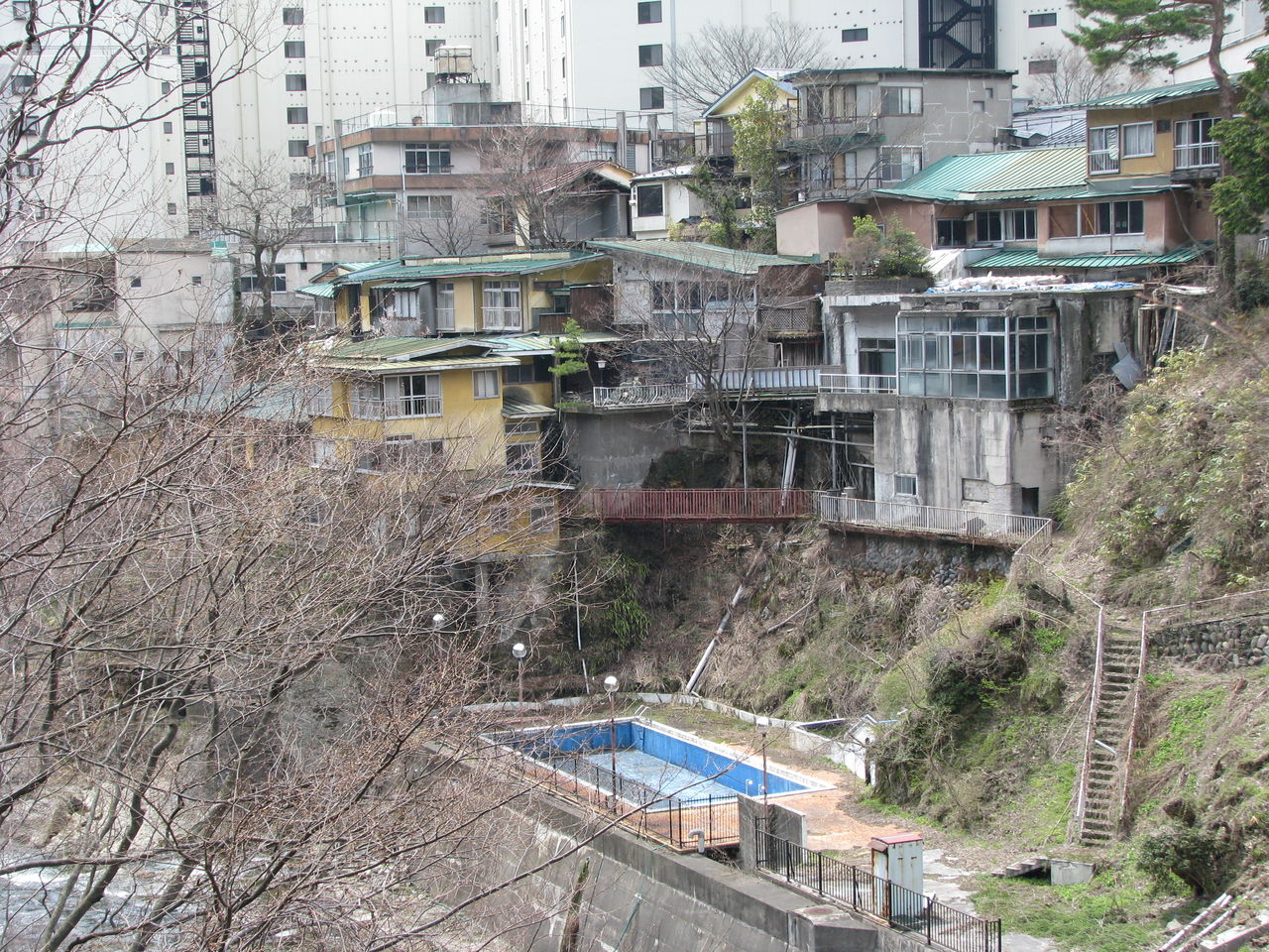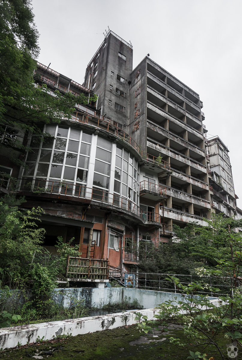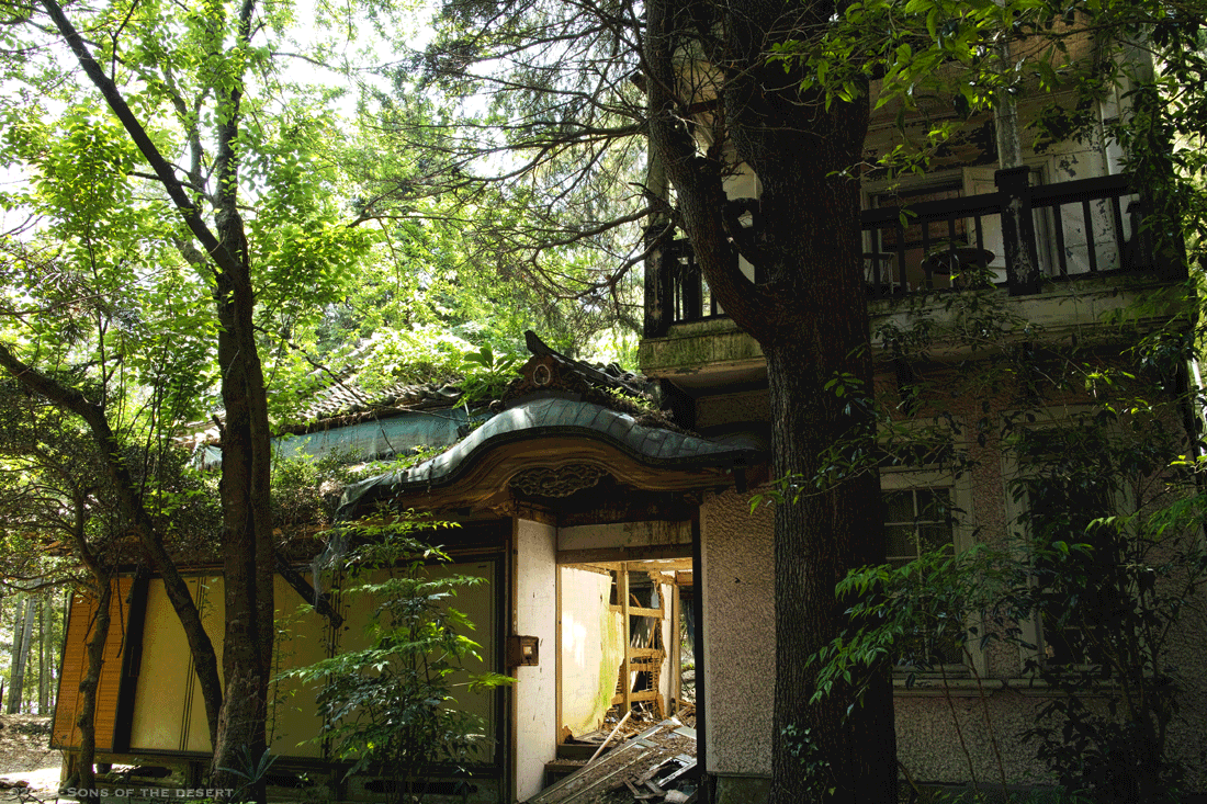 池の手前から見ると、池の奥に佇む料亭の雰囲気は良いが、立地が悪かったのか長い間廃墟化しているようだ。