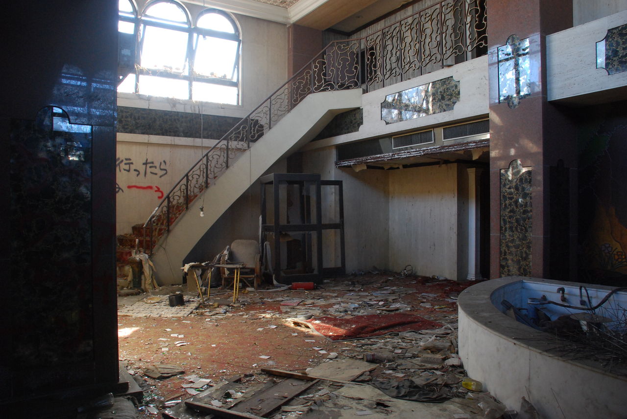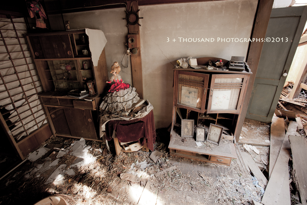 朽ち果てた建物内には新郎新婦の写真やウエディングドレスなどが放置されている。