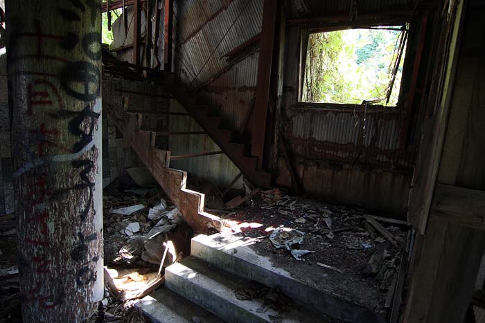 内部はかなり傷んでおり、このような木造物件に訪れる際は二階以上の床が抜けやすいので注意する必要がある。