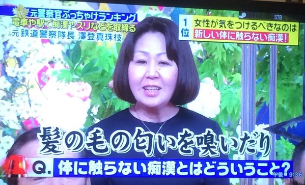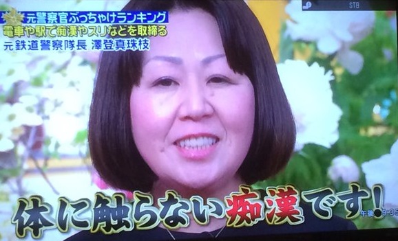 話題になっているのは、2016年5月7日放送の「ジョブチューン~アノ職業のヒミツぶっちゃけます!」(TBS系)の一コマだ。この日は元警察関係者らがスタジオに集結し、業界の秘密をぶっちゃけた。その中で、元鉄道警察隊長の澤登真珠枝氏は「新たな痴漢」として「体に触らない痴漢」の手口を次のように紹介した。