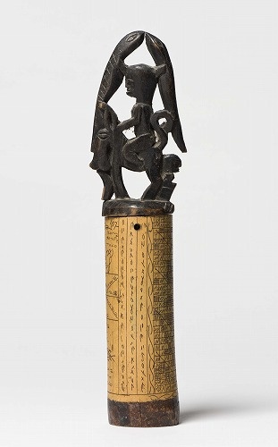 バタク文字。薬(呪薬)を入れる容器。インドネシア、スマトラ島のトバ・バタク民族が用いる文字。