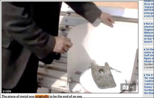 材質が軽い金属であることと、人工物のような不自然な形状から、斧の先端部ではないかと一時的に判断された。