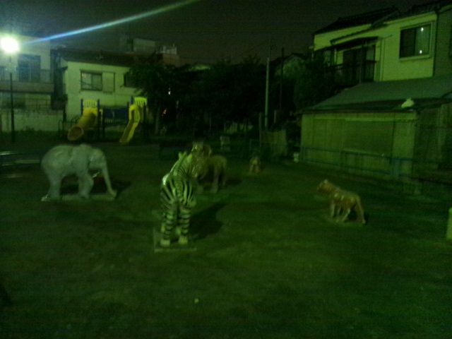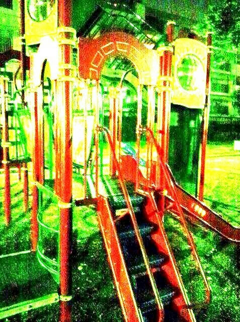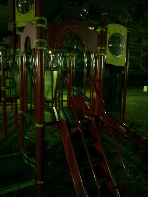 真ん中にあるアスレチックみたいな滑り台の近くを通りかかったときに、滑り台に上る梯子のところに何かがあるように見えたんですね