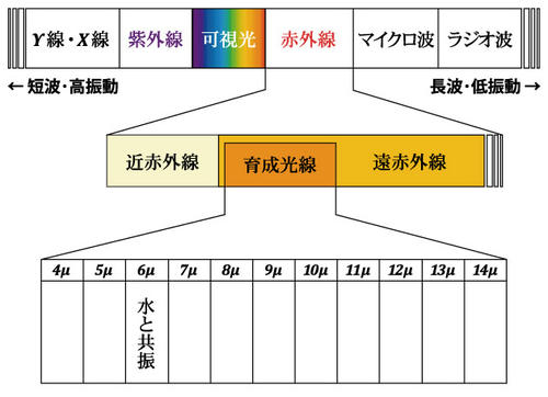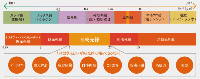 人体の細胞と共振共鳴作用をおこす6~20μmの波長のこと。身体や髪を元気にするエネルギーで人体から出ているエネルギーと同じなので身体にもっとも優しいエネルギーなのです。