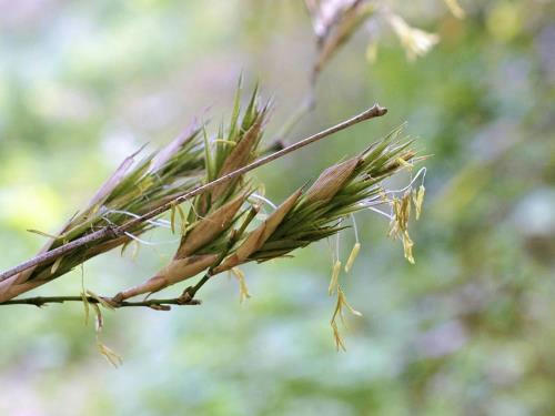 稲穂のようなハチクの花。穂先から雄しべが飛び出している(静岡県南伊豆町で)