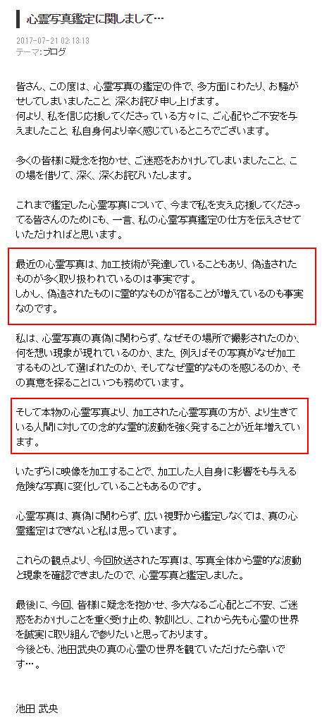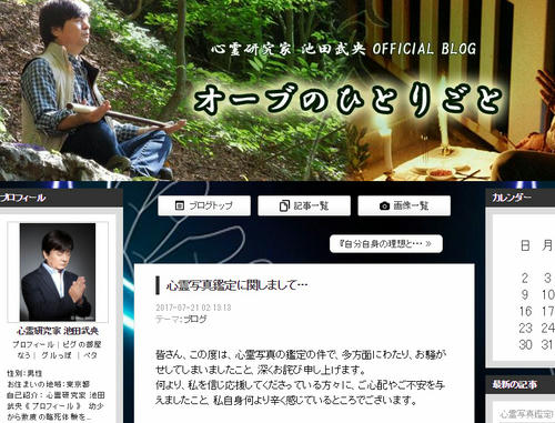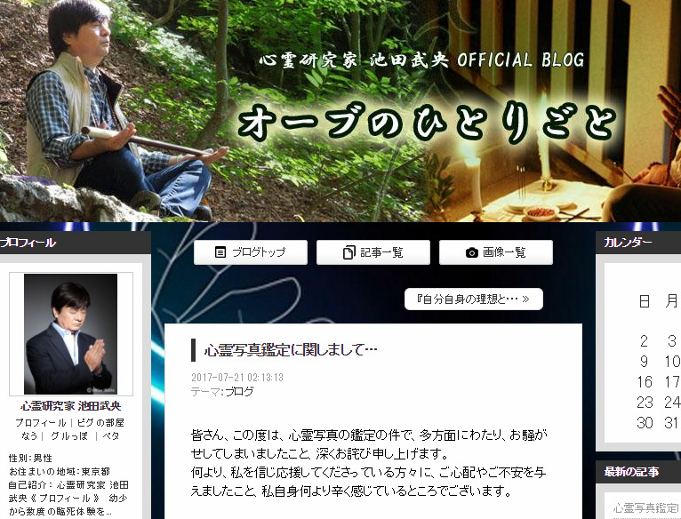 心霊研究家の池田武央氏が、無断使用、そして加工された画像について自身のブログにて言及。