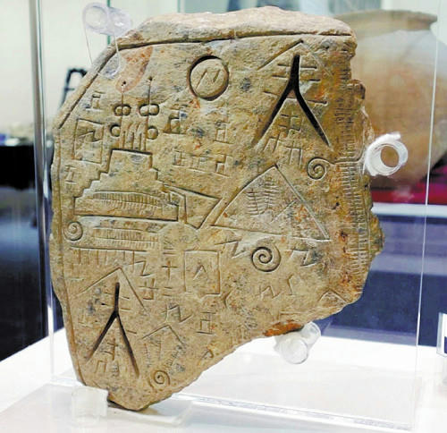 話題の石板は縦36センチ、横26センチ、厚さ4センチ。左側に建物の形にも見える絵があり、「人」という文字に似た模様は特に彫りが深い。