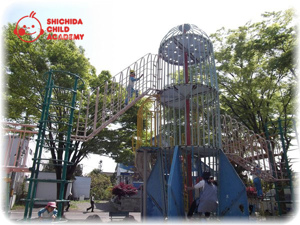 こんな感じのジャングルジムと滑り台が複合になった大型遊具があって中間のブリッジはハシゴを真横にしたような構造