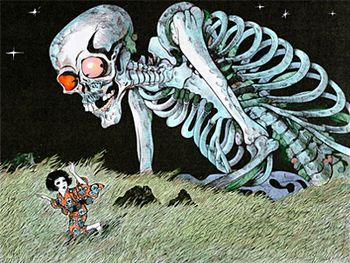 巨大な骸骨って漫画版ナウシカや進撃の巨人の表紙絵にも巨大な骸骨出てくるけどどれもやはり不思議な魅力がある題材だよね