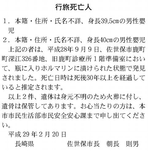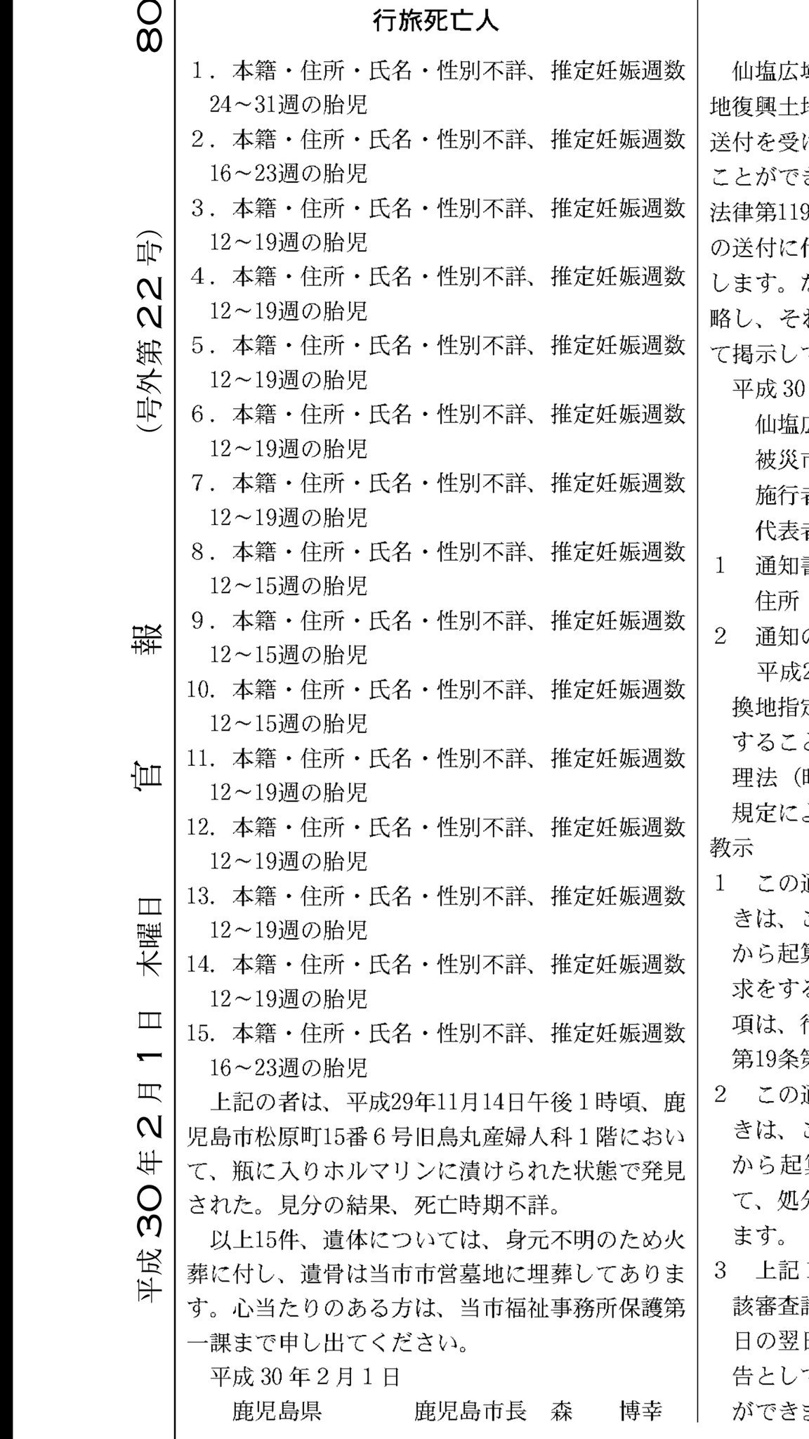 2月1日の官報に大量の胎児が「行旅死亡人(こうりょしぼうにん)」として公告された。
