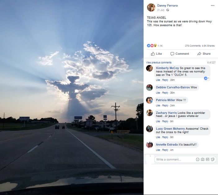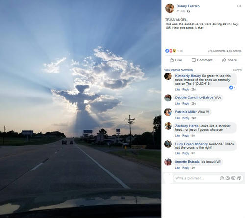 美しく、珍しい光景を目撃できたことに感謝しているダニーさんは、自身のFacebookに「テキサス・エンジェル」と題して日没に現れた天使の雲をシェアした。