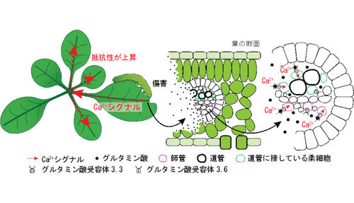 またCa²⁺シグナルを発生させるためには、うまみ成分として知られているグルタミン酸が流出し、植物の養分を運ぶ管である師菅等に発現している、グルタミン酸受容体を活性化させる必要があることが分かった。