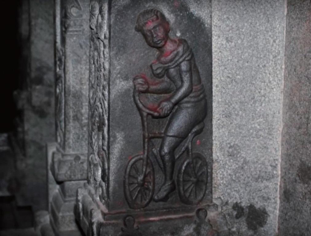 自転車が発明されたのは1800年代のヨーロッパだ。わずか200年ほど前の出来事でしかない。しかしパンチャヴァルナスワミー寺院が建立されたのは今から2000年前だ。時系列を考えればオーパーツ的な遺物ということになるのだろうが、レリーフに彫られているのは本当に自転車なのだろうか。