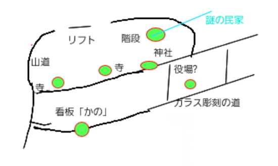 で、最初に見たのは山道、次が謎の民家、階段その次はガラス彫刻の道、最後にお寺さん、看板「かの」です