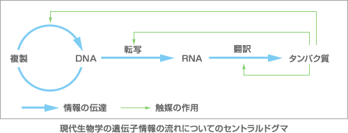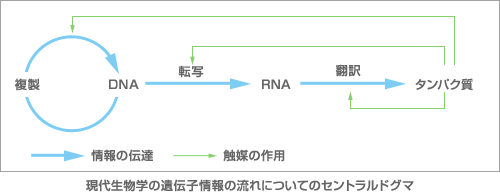 このDNAを出発点としたRNAの仲介を介して行われる一連のタンパク質生成過程は「セントラルドグマ(中心教義)」と言われており、現代の分子遺伝学の中心となっている原理です。