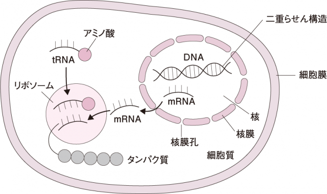 私たちの体をつくるタンパク質は、DNAにコードされた設計図を、様々な種類のRNAが仲介することによって生成されます。
