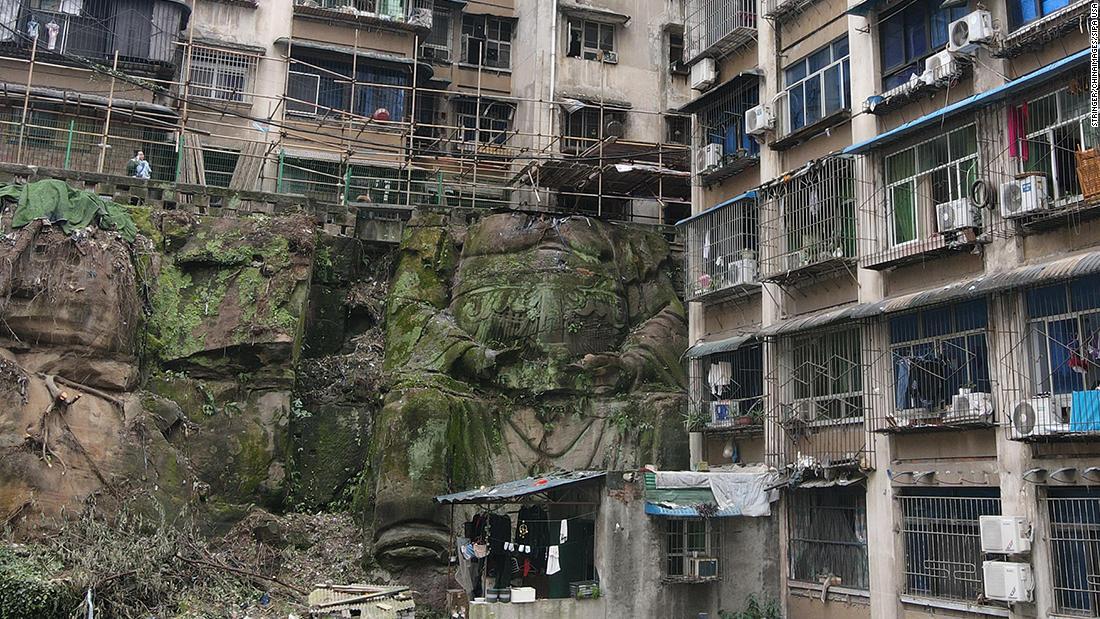 中国南西部の重慶市で、急斜面上にある2棟の集合住宅のビルの下から岩面に掘られた巨大な石像が見つかり話題になっている。