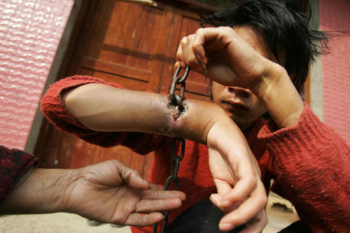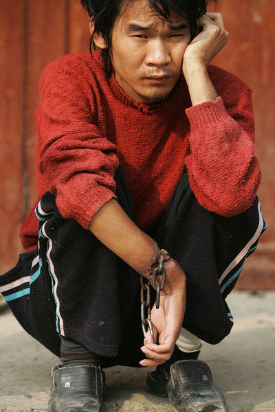中国 湖南省 張家界市で 精神病の男を 村の幹部などが鉄製のチェーンで牛小屋に3年間閉じ込めておいたところ、なんとチェーンが腕を貫通。