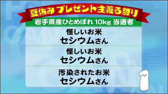 実際に放送された内容。岩手県産「ひとめぼれ」10kgの当選者が「怪しいお米 セシウムさん」「汚染されたお米 セシウムさん」と表示されています。いったいどうしてこんなことになってしまったのでしょうか……。