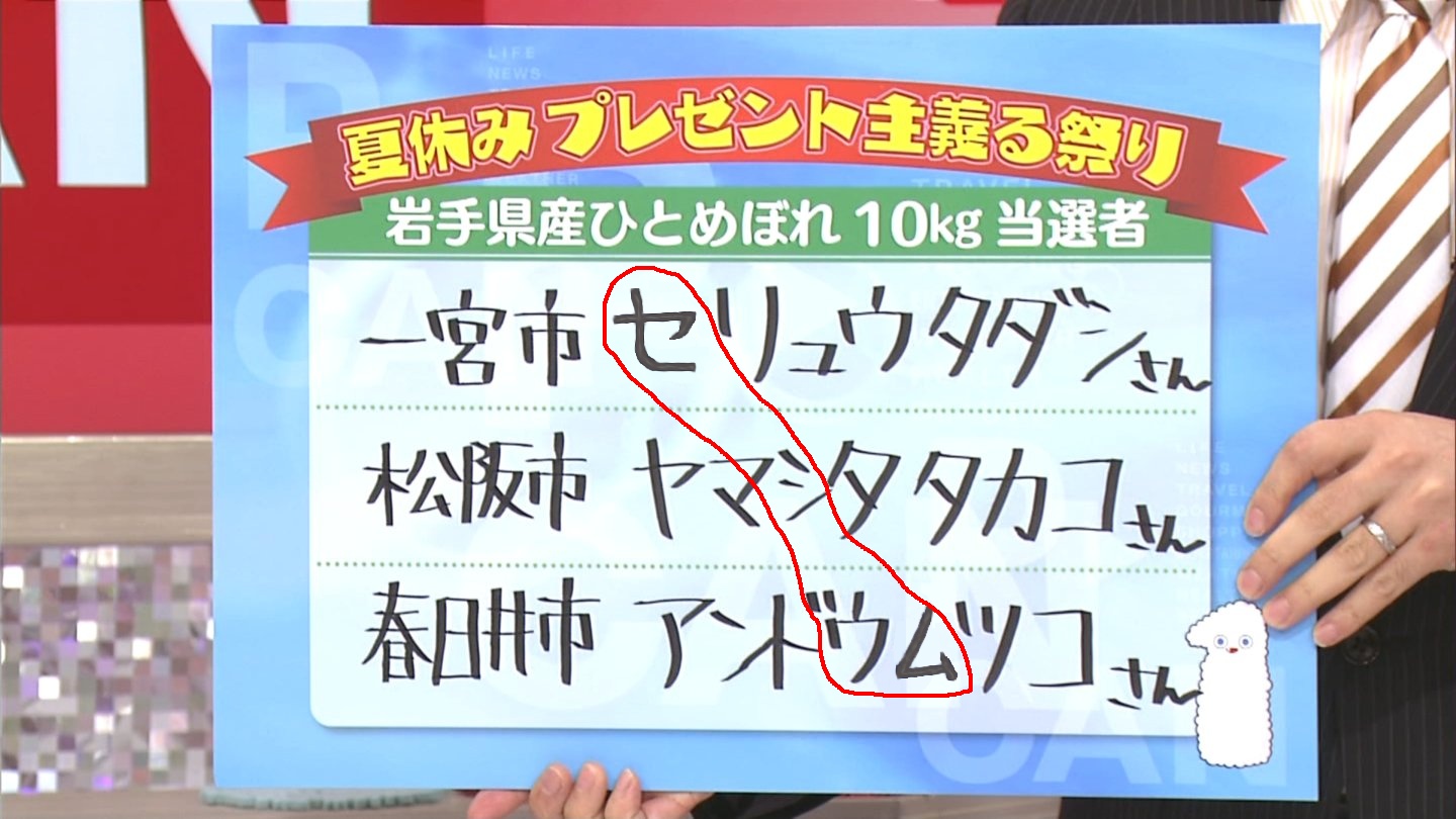 原因:テロップ政策担当者が、”夏休みプレゼント主義る祭り”の岩手県産ひとめぼれ10kg当選者が決定される前に作成したリハーサル用の仮テロップが、操作ミスで送出されたため。