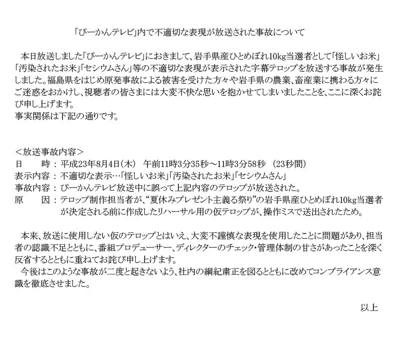 2011年8月4日(木)あさ9時55分から放送の「ぴーかんテレビ」におきまして、番組途中、「夏休みプレゼント主義る祭り」の当選者をお知らせする内容に不適切な記述が誤って送出されました。